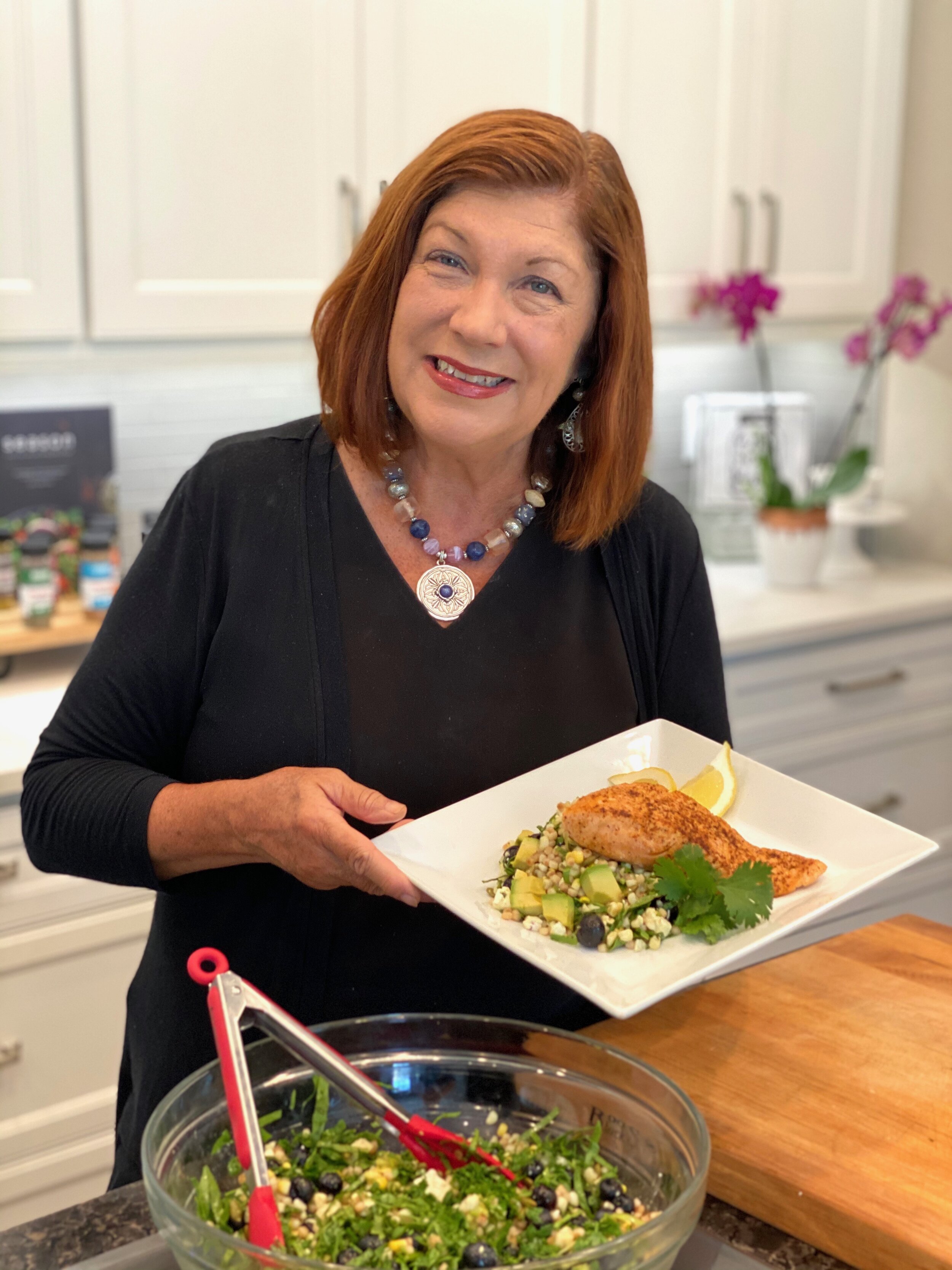 To assemble the salad, combine the couscous and corn, blueberries, baby spinach, herbs, olive oil and vinegar, Citrus Spice and 1 teaspoon of Creole seasoning. Taste and adjust seasonings, if needed.